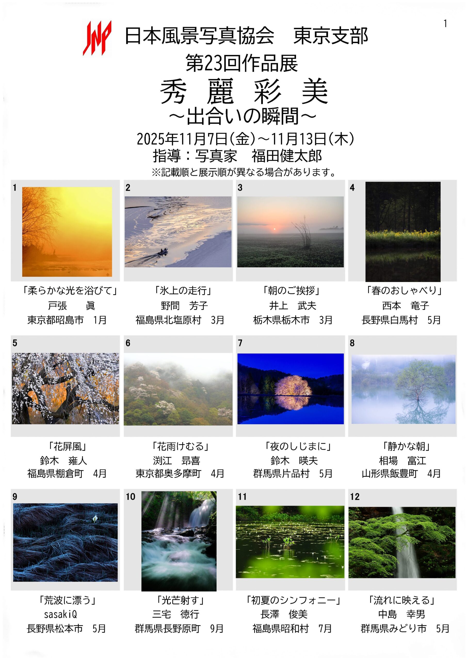★日本風景写真協会 第9回選抜展「四季のいろ」 2026年5月8日(金)~5月14日(木) 富士フイルムフォトサロン東京 丹地敏明賞 「浮遊する下り花」 佐々木節子 白幡史郎賞 「輝きに舞う」 戸張 眞 入選 「ゆらぎの中」 菅澤光裕 入選 「春風のリズム」 大竹 晋
